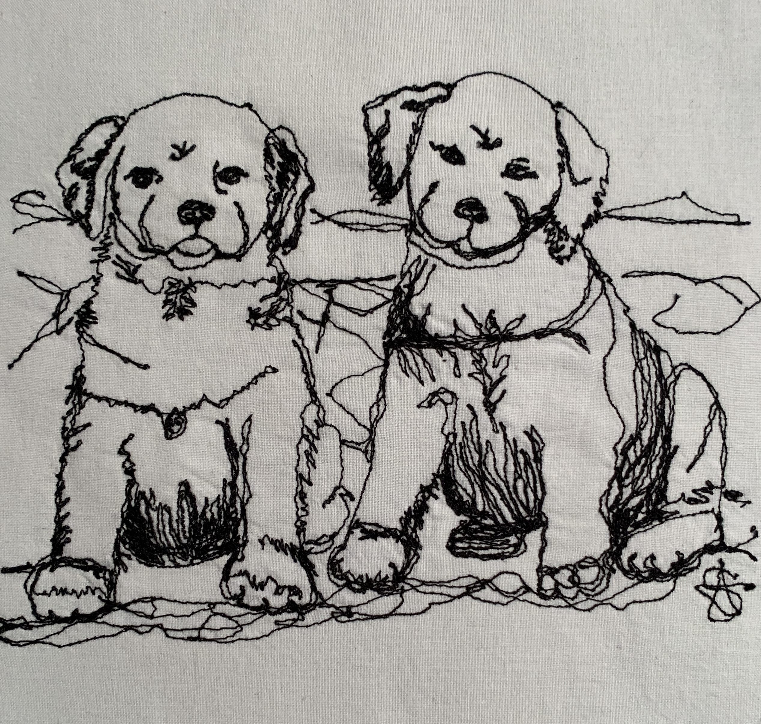 6”x6” thread drawing, black cotton thread on white cotton fabric, gently mounted on card stock in cello sleeve